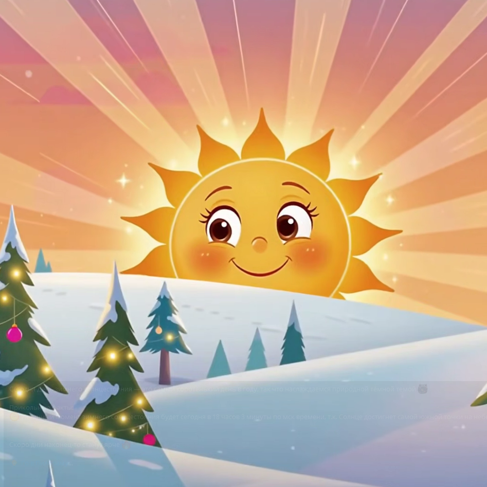 • Истинный момент зимнего солнцестояния будет сегодня в 18 часов 3 минуты по мск времени, т.к. Солнце достигнет самой южной точки на небе.