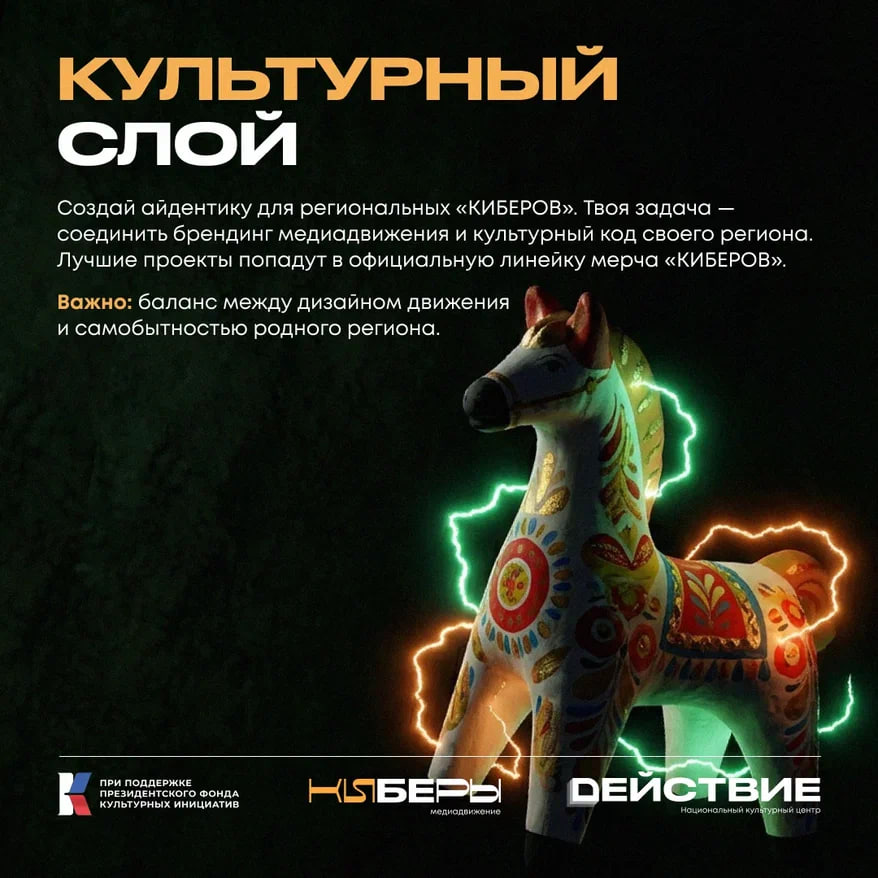 Создай айдентику для регионального медиадвижения «КИБЕРЫ». Твоя задача — соединить современный медийный стиль и культурный код своего региона: фольклор, орнаменты, символы, смыслы. Лучшие проекты попадут в официальную линейку мерча «КИБЕРОВ». Акцент — баланс между актуальным дизайном и самобытностью родного региона.