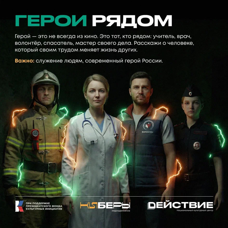 Герой — это не всегда из кино. Это тот, кто рядом: учитель, врач, волонтёр, спасатель, мастер своего дела. Расскажи о человеке, который своим трудом меняет жизнь других. Акцент — служение людям, современный герой России.